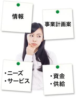 どんなに自分が事業としてやりたいことがあっても、そのサービスを利用したいという世の中のニーズや、サービスの供給方法、告知方法、資金がないと事業は成立しません。